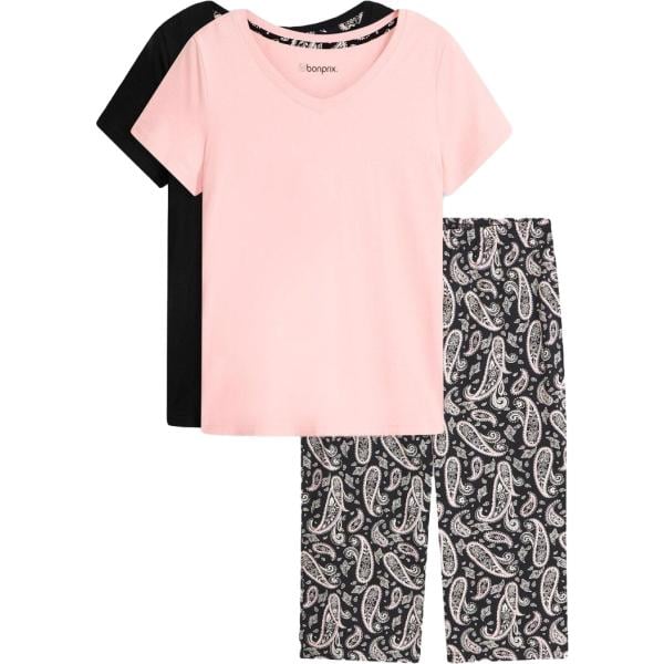 Pigiama da donna in nero pece con stampe completo a maniche corte in cotone