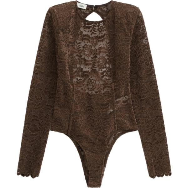 Corpo da donna in marrone scuro a fiori con pizzo girocollo a maniche lunghe a vita alta