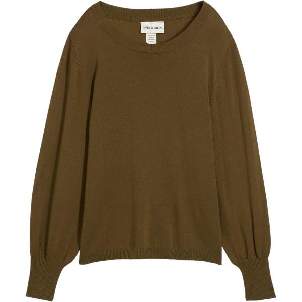 Stivaletti da donna in marrone scuro bonprix, Parka da donna in marrone scuro collo alto corto con zip in cotone bonprix, Pantalone chino da donna in verde scuro bonprix, Orecchini da donna in arancione chiaro in paglia bonprix, Maglione da donna in beige sabbia bonprix, Borsa a mano da donna in marrone scuro con fibbia bonprix.