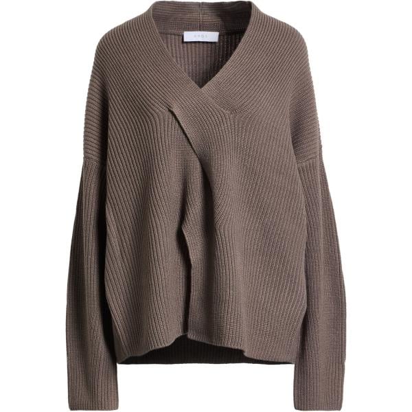 Maglione da donna a girocollo marrone con trecce Woolrich, pantaloni da donna skinny marroni modellanti Freddy, sneakers da donna marroni felpate Woolrich, borsa da donna a tracolla marrone con tasca doppia Borbonese.