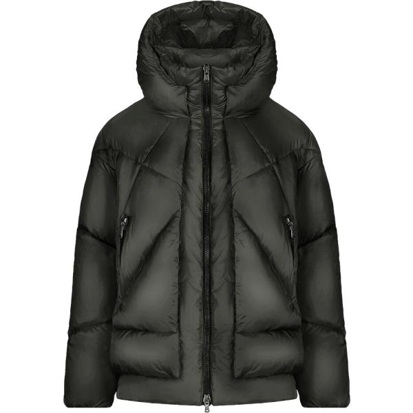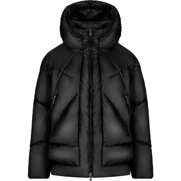 Piumino da donna in nero pece collo con cappuccio corto con zip in poliestere