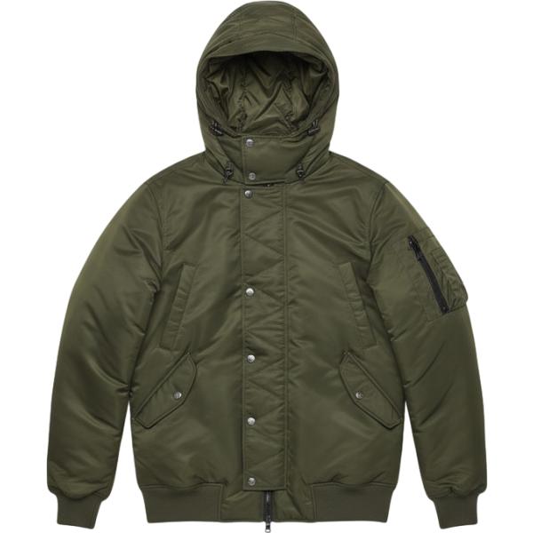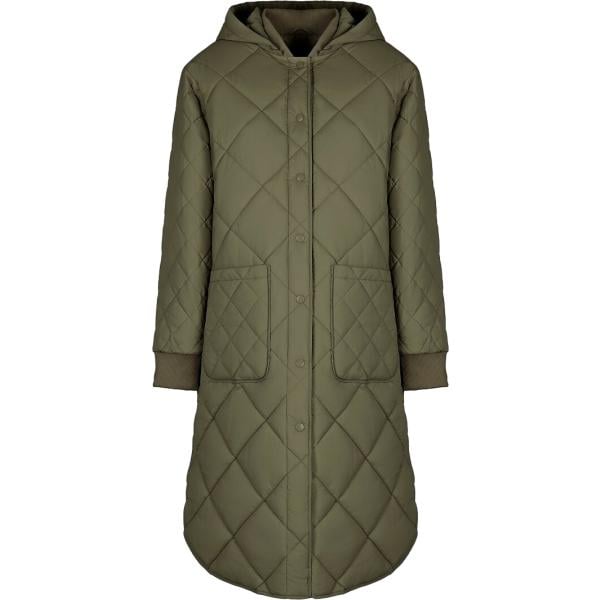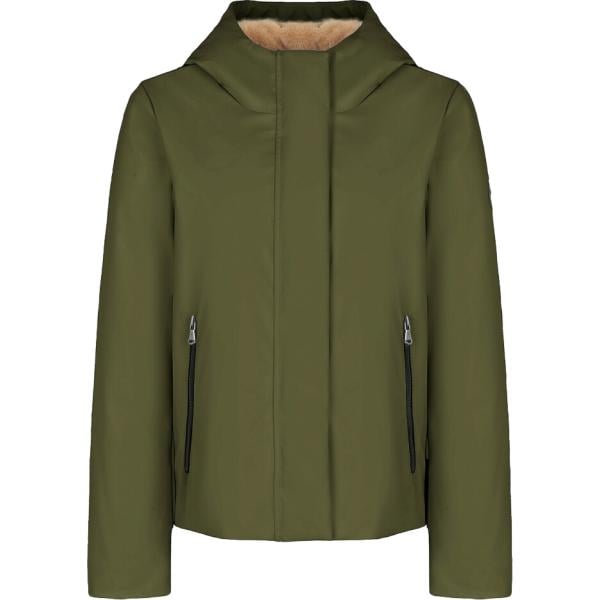 Piumino da donna in verde oliva plissè collo con cappuccio lungo con zip in poliestere