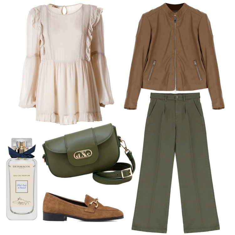 Blusa da donna con ruches girocollo a maniche lunghe in viscosa Fracomina, Braccialetto da donna in marrone lavorato a maglia in oro Ice-Watch, Mocassini da donna in marrone effetto scamosciato in pelle Primopiano, Pochette da donna in poliestere Dixie, Giubbotto da donna in marrone con zip in poliestere Imperial, Pantaloni a palazzo da donna in verde chiaro in cotone Dixie.