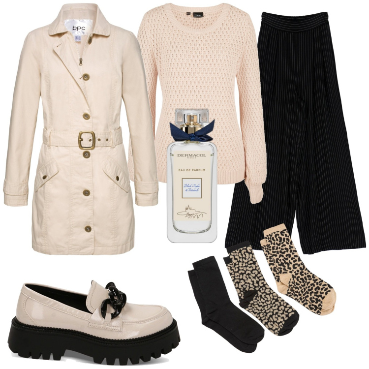 Trench da donna in beige con bottoni Bonprix, Maglione da donna in beige lavorato a maglia con scollo Bonprix, Pantaloni a palazzo da donna in nero a righe a vita alta in poliestere Dixie, Calzini da donna in giallo oro animalier Terranova, Profumo da donna in nero Dermacol, Mocassini da donna in panna Primadonna Collection.