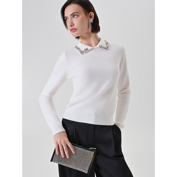 Collana da donna in beige sabbia con perle Lauren, Cappotto da donna in bianco avorio maxi con bottoni Terranova, Maglione da donna a righe intimo a vita alta in viscosa Rinascimento, Pochette da donna in nero pece con borchie corto con zip Imperial, Stivaletti da donna forma svasata in grigio scuro con tacco a punta con cinturino Ferre', Gonna longuette da donna in nero pece con spacco a vita alta Imperial.