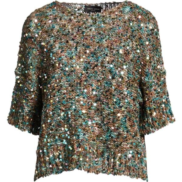 Pullover da donna in verde oliva con paillettes girocollo a maniche corte in cotone