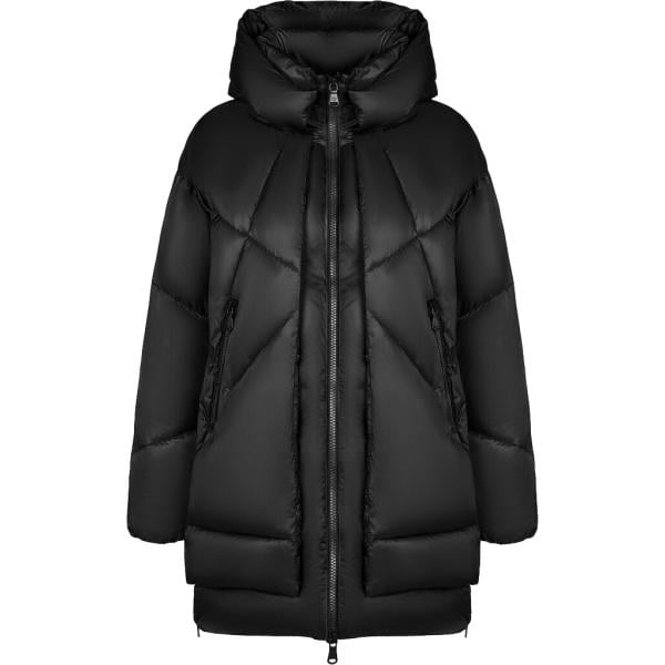 Piumino da donna in nero pece collo con cappuccio tessuto impermeabile con zip in poliestere