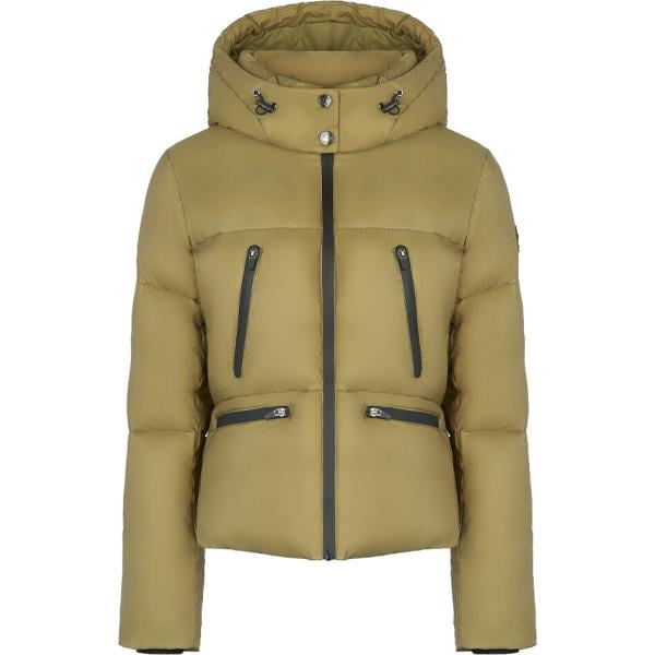 Piumino da donna in verde oliva collo con cappuccio corto con zip in poliestere