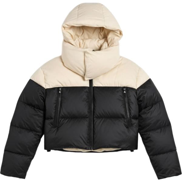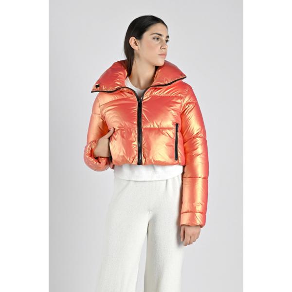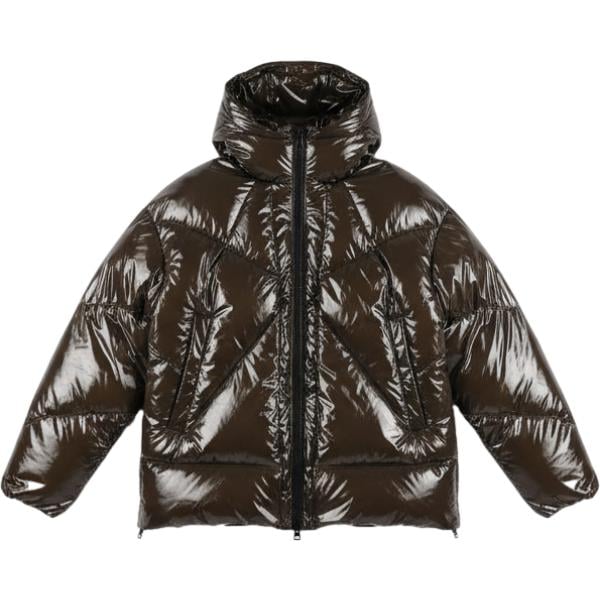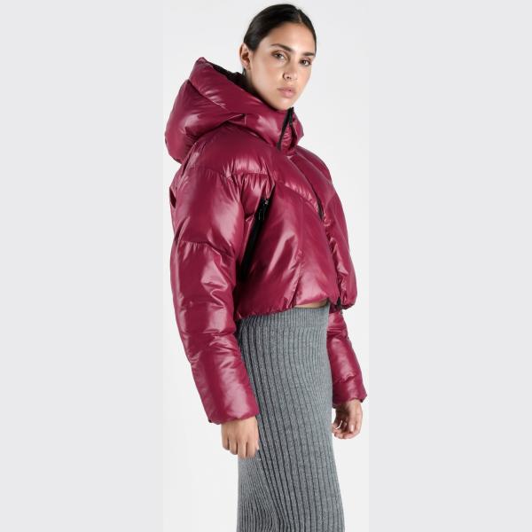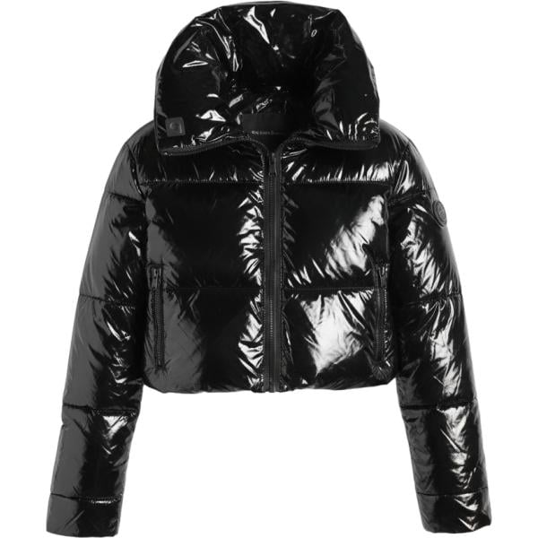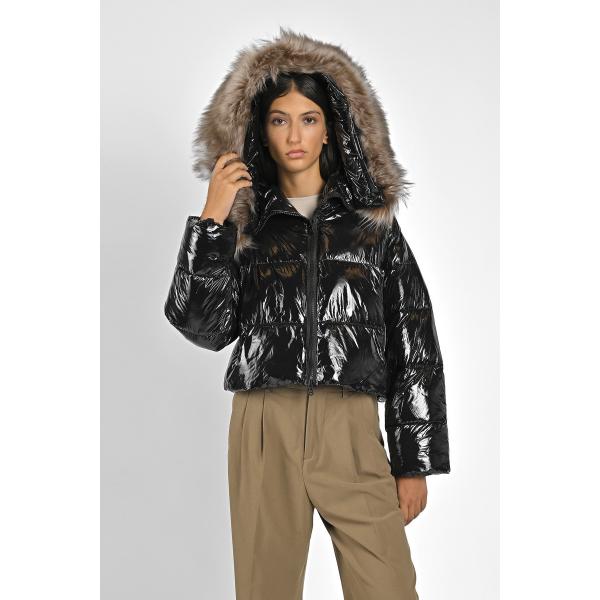 Piumino da donna in nero pece effetto lucido collo con cappuccio corto con zip in poliestere