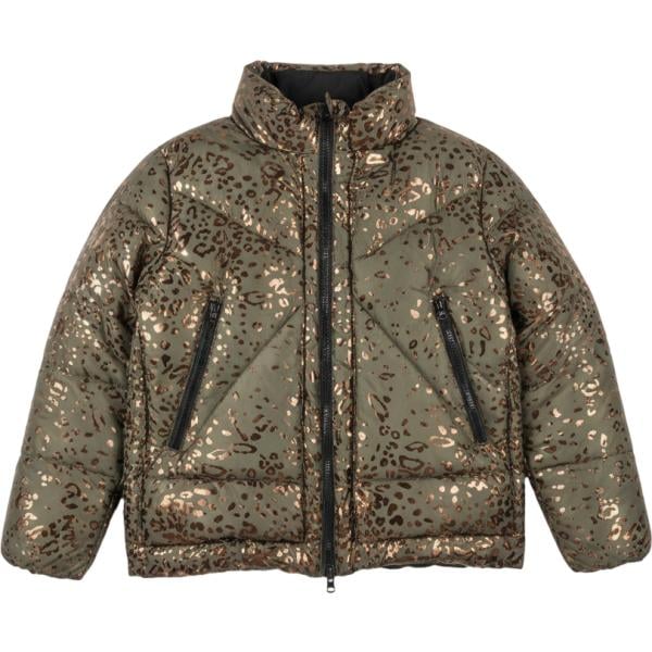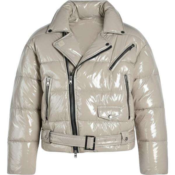 Giacca da donna in marrone chiaro con stampe effetto laminato collo con cappuccio corto con zip in poliestere