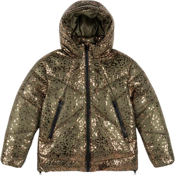 Giacca da donna in marrone chiaro con stampe effetto laminato collo con cappuccio con zip in poliestere