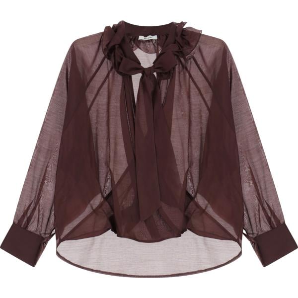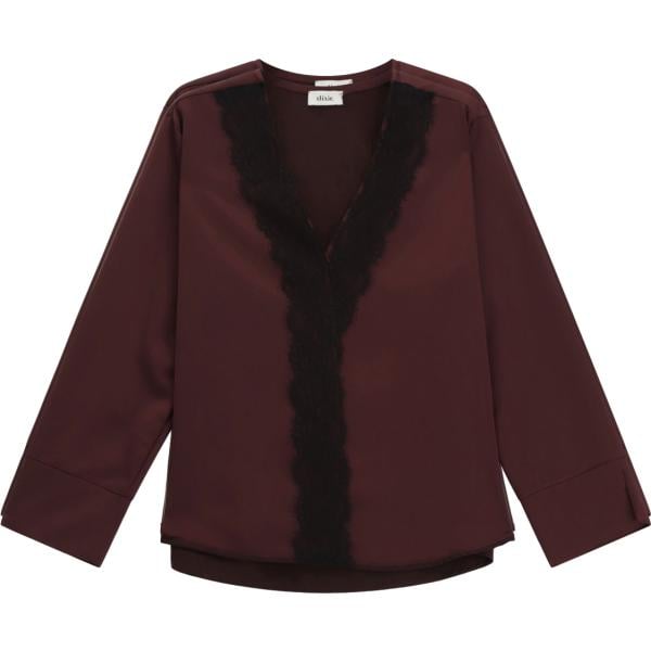 Blusa da donna in marrone scuro con pizzo collo a v a maniche lunghe