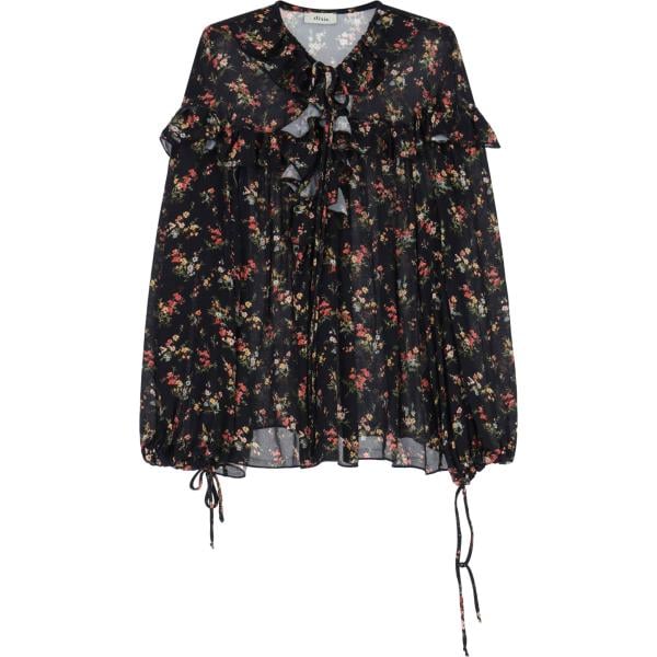 Blusa da donna in nero pece con stampe con ruches con scollo con lacci