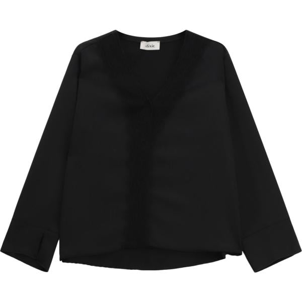 Blusa da donna in nero pece con pizzo collo a v a maniche lunghe