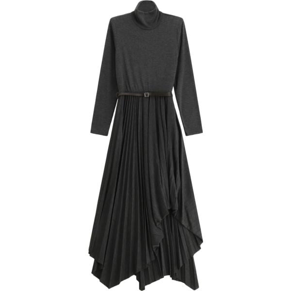 Vestito lungo da donna in nero pece plissè collo alto lungo a maniche lunghe con cintura