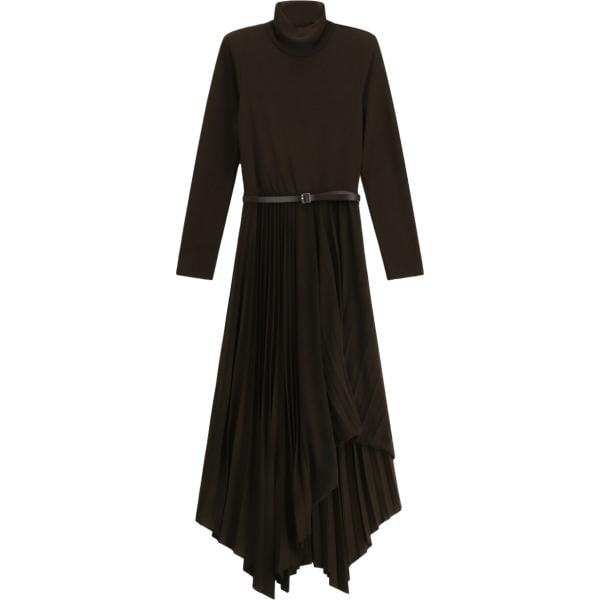 Vestito lungo da donna in marrone scuro plissè collo alto lungo a maniche lunghe con cintura