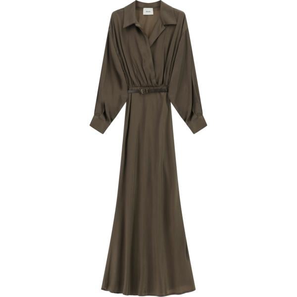 Vestito lungo da donna in verde oliva collo a v lungo a maniche lunghe con cintura