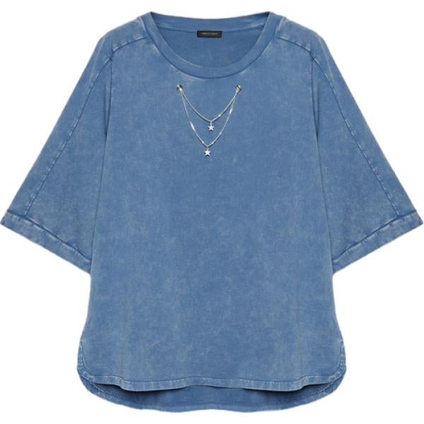 Felpa da donna in blu medio con perle girocollo a maniche corte in cotone