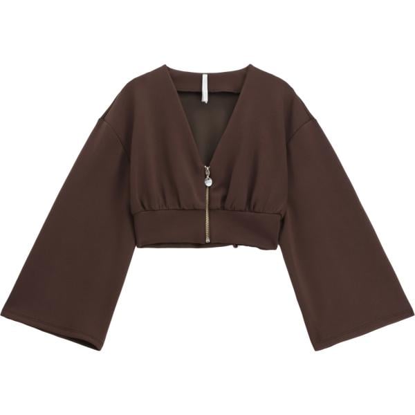 Blusa da donna in marrone scuro con scollo corto a maniche lunghe con zip