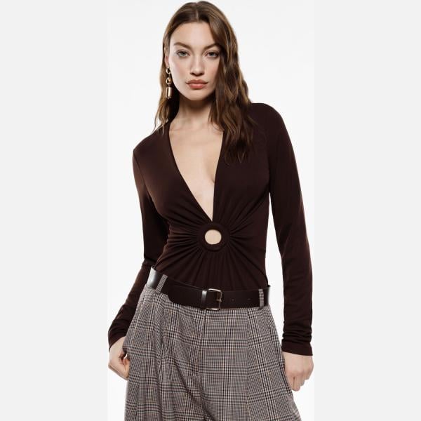 Top da donna in marrone scuro con scollo a maniche lunghe