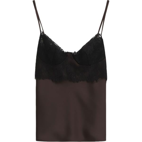 Top da donna forma asimmetrica in marrone scuro animalier con pizzo con spalline lungo