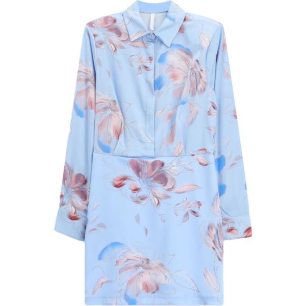 Vestito corto da donna in azzurro con stampe collo classico corto a maniche lunghe