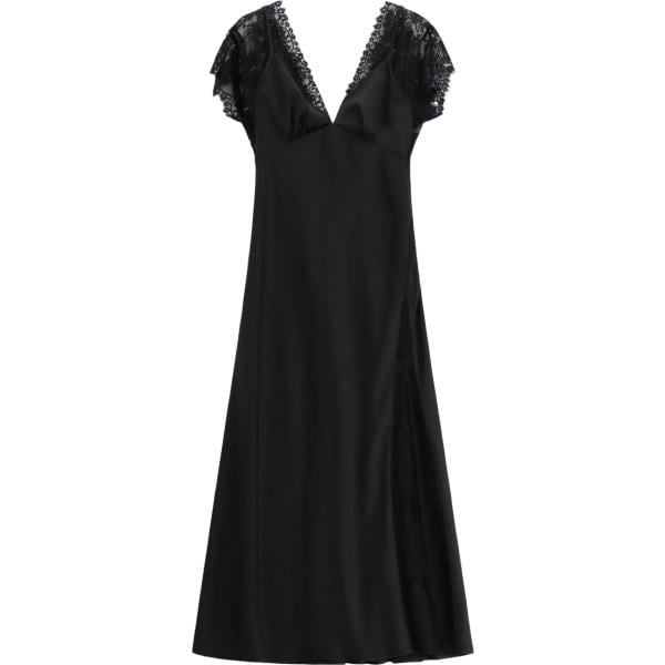 Vestito lungo da donna in nero pece con pizzo collo a v con spacco a maniche corte