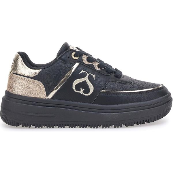 Sneakers da donna in nero pece effetto laminato con tacco zeppa