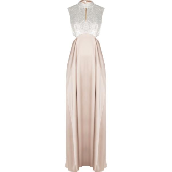 Vestito lungo da donna in grigio chiaro con paillettes collo alto lungo senza maniche