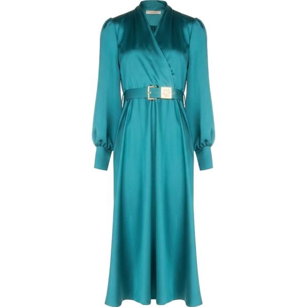 Vestito longuette/midi da donna in azzurro collo a v con fibbia