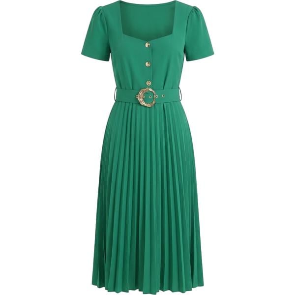 Vestito longuette/midi da donna in verde scuro plissè con tacco con scollo a maniche corte con fibbia in cotone