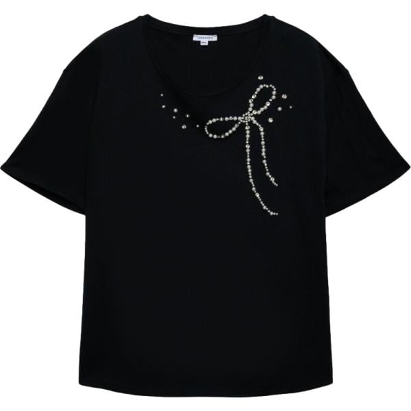 T-shirt da donna in nero pece curvy con fiocco collo a v a maniche corte in cotone