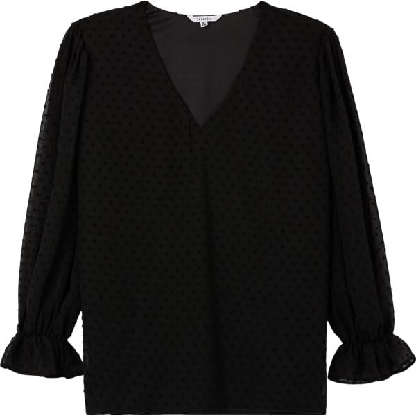 Blusa da donna in nero pece a pois con ruches collo a v a maniche lunghe