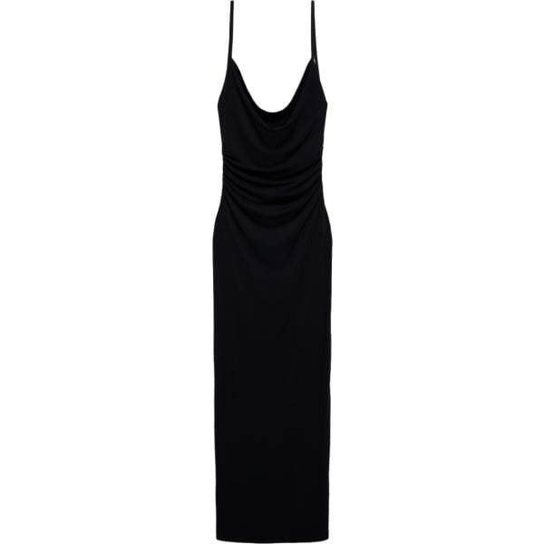 Vestito lungo da donna in nero pece con ruches con spalline lungo in poliestere