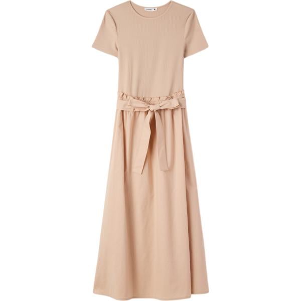 Vestito lungo da donna in beige sabbia con pizzo con tacco girocollo lungo a maniche corte in cotone