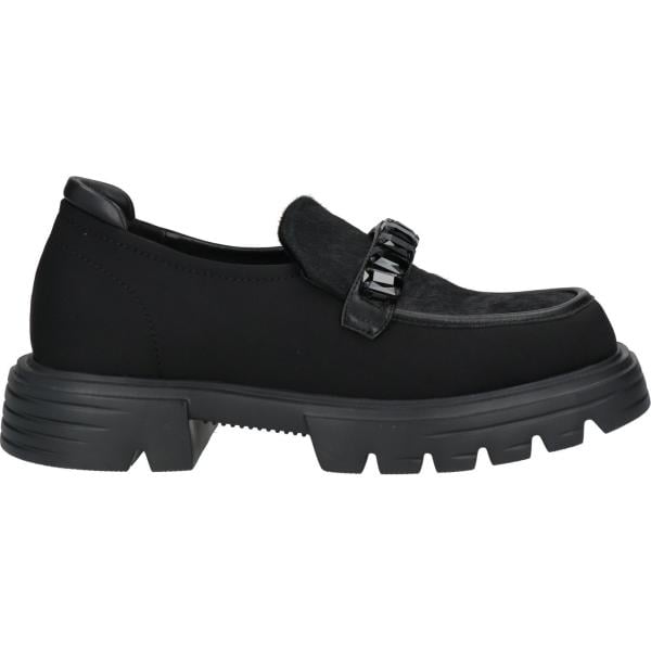 Mocassini da donna in nero pece effetto vernice con tacco squadrato a punta tonda in metallo