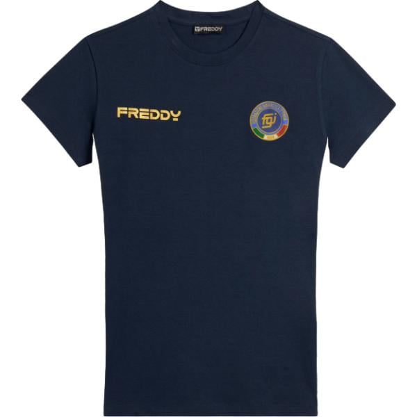 T-shirt sportiva da donna in nero pece con stampe collo a v a maniche corte