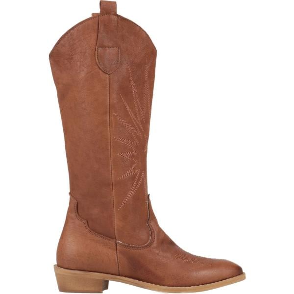 Gonna svasata color sabbia IMPERIAL, maglia lana fantasia geometrica Please, giacchina marrone corta maniche pipistrello con zip IMPERIAL, stivali sabbia Colors of California, borsetta a spalla Rinascimento.