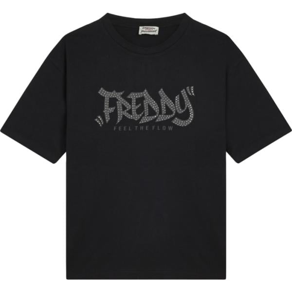 Una t-shirt che non passa inosservata: realizzata in jersey di cotone Supima offre comfort e morbidezza con una marcia in più. Il petto è impreziosito da un’applicazione in mesh decorata dal logo FREDDY in strass per un tocco luminoso che esalta lo stile sportivo-chic. Scollo tondo maniche corte e fondo dritto completano il design a vestibilità regular.