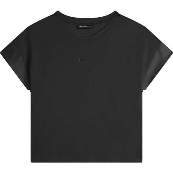 Aggiungi un tocco dinamico al tuo outfit con questa t-shirt cropped in jersey leggero. Il comfort fit il fondo dritto con piccoli spacchi laterali e lo scollo girocollo la rendono perfetta per ogni occasione. Le maniche corte con spalla scesa e la grande stampa FREDDY MOV metallizzata e multicolore al centro completano un capo moderno e grintoso.