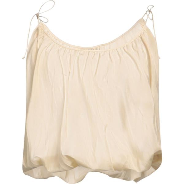 Piumino da donna in bianco neve in rayon Canadian, Top da donna in beige sabbia corto a maniche corte Please, Sneakers da donna in marrone chiaro con perle con lacci Dixie, Shopping bag da donna in marrone chiaro in nylon Canadian, Pantaloni a palazzo da donna in bianco avorio con zip Please.