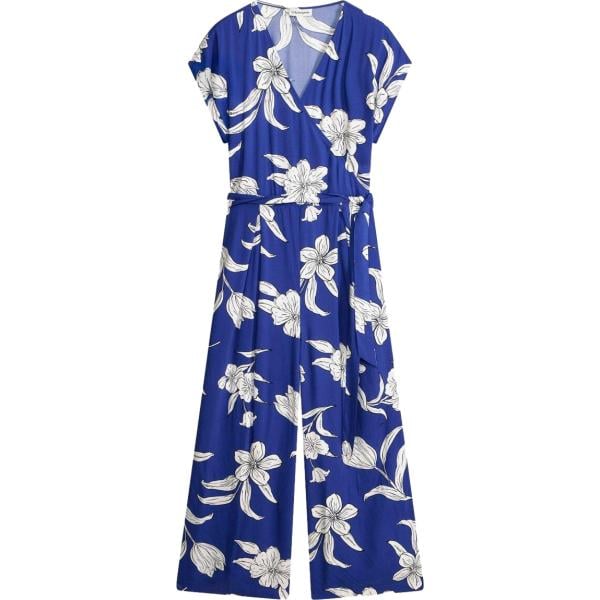 Tuta da donna in blu scuro con stampe collo alto a maniche lunghe con fibbia Rinascimento