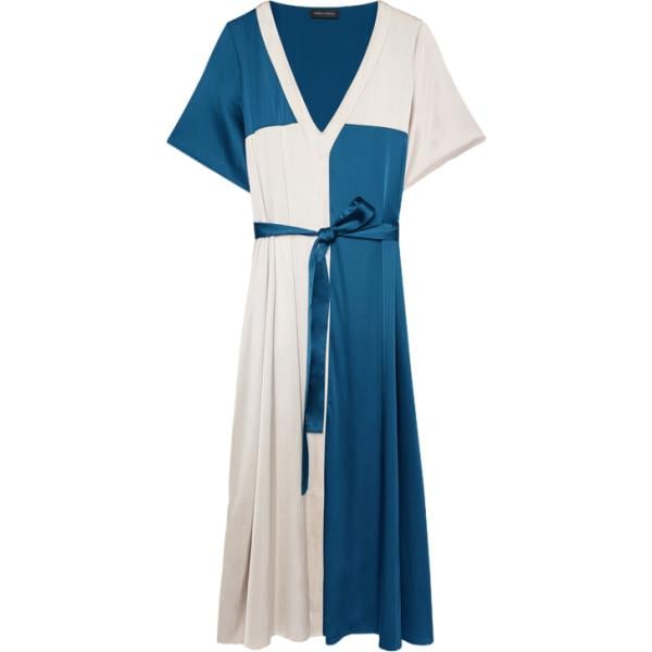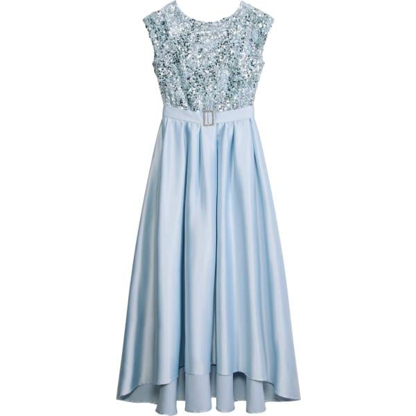 Vestito lungo da donna in azzurro con stampe con ruches con tacco con scollo lungo a maniche lunghe con cintura