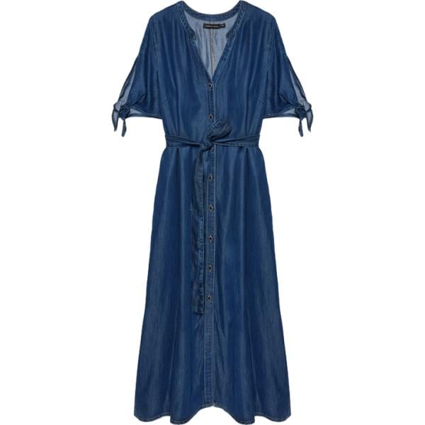 Vestito lungo da donna in blu scuro collo a v lungo a maniche corte con lacci in denim