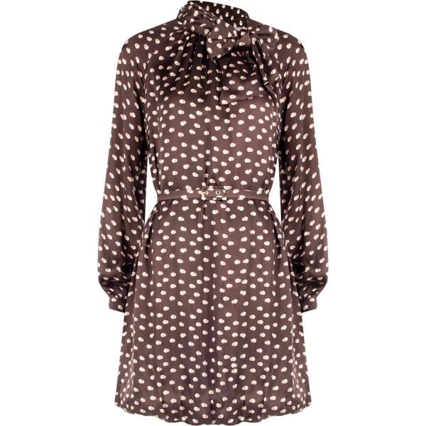 Vestito chemisier da donna in marrone scuro a pois con fiocco collo alto made in italy con cintura in viscosa