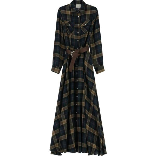 Vestito lungo da donna in nero pece a quadri lungo con cintura