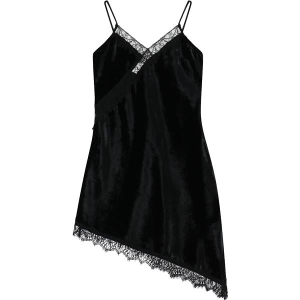 Design minimalista e silhouette fluida caratterizzano questo abito corto con spalline sottili. L’inserto in pizzo sullo scollo a v e sul fondo dona raffinatezza, mentre la linea asimmetrica ispira possibilità di stile distintive. Ideale per comporre look urbani e personali grazie alla varietà di colori disponibili.