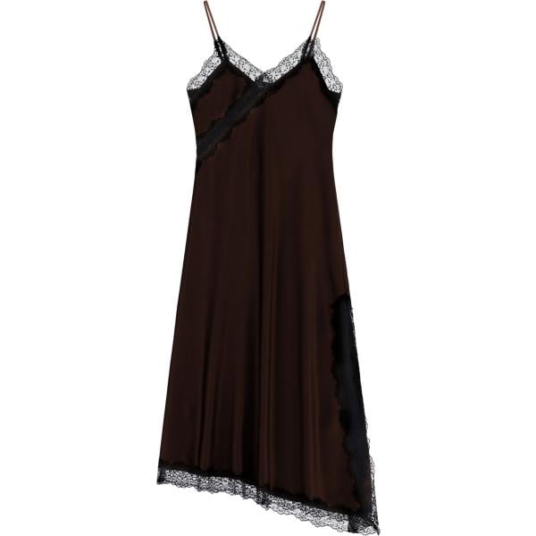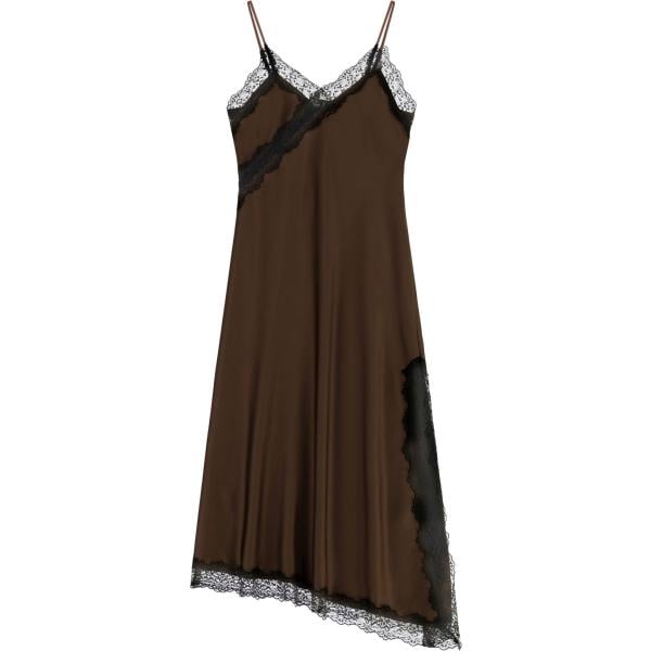 Pochette da donna in beige sabbia effetto laminato in metallo Vivienne Westwood, Orecchini da donna a goccia in marrone chiaro con perle Lauren, Sandali con tacco da donna in bianco avorio con tacco Dixie, Braccialetto da donna in marrone chiaro con perle in oro Lauren, Vestito asimmetrico da donna in marrone chiaro effetto laminato Lauren.