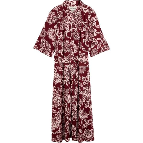 Una cintura in vita valorizza la silhouette svasata di questo abito, che unisce un leggero tessuto in georgette increspato a eleganti volant e a una gonna a balze, creando un movimento naturale e disinvolto. Questa versione presenta una stampa floreale stilizzata nei toni del rosso e del beige.