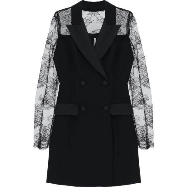 Abito corto con taglio sartoriale, collo coreano e maniche al gomito. Il dettaglio di apertura frontale decorato da una spilla floreale dorata dona carattere distintivo. Chiusura posteriore con zip invisibile per una vestibilità strutturata e sofisticata, ideale per interpretare look contemporanei dal forte impatto visivo.